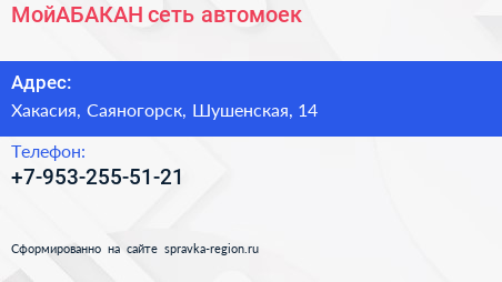 МойАБАКАН, сеть автомоек по адресу Хакасия, Саяногорск, Шушенская, 14 в дальнейшем Организация, размещена в следующих категориях: