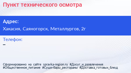 Пункт технического осмотра по адресу Хакасия, Саяногорск, Металлургов, 2г в дальнейшем Организация, размещена в следующих категориях: