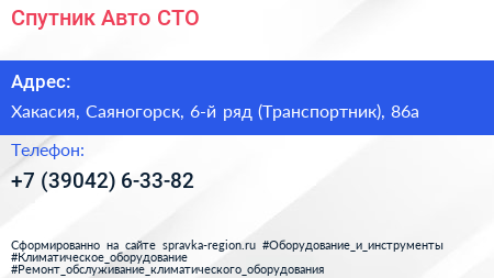 Спутник Авто, СТО по адресу Хакасия, Саяногорск, 6-й ряд (Транспортник), 86а в дальнейшем Организация, размещена в следующих категориях: