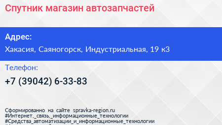 Спутник, магазин автозапчастей по адресу Хакасия, Саяногорск, Индустриальная, 19 к3 в дальнейшем Организация, размещена в следующих категориях: