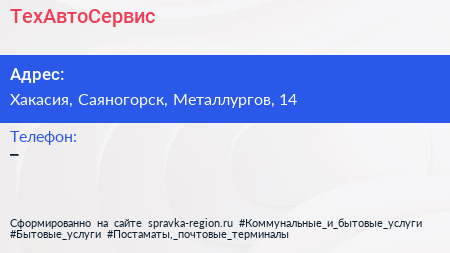 ТехАвтоСервис по адресу Хакасия, Саяногорск, Металлургов, 14 в дальнейшем Организация, размещена в следующих категориях:
