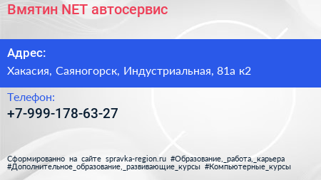 Вмятин.NET, автосервис по адресу Хакасия, Саяногорск, Индустриальная, 81а к2 в дальнейшем Организация, размещена в следующих категориях: