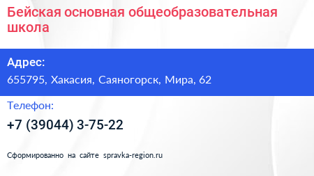 Бейская основная общеобразовательная школа по адресу 655795, Хакасия, Саяногорск, Мира, 62 в дальнейшем Организация, размещена в следующих категориях: