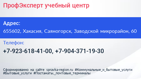 ПрофЭксперт, учебный центр по адресу 655602, Хакасия, Саяногорск, Заводской микрорайон, 60 в дальнейшем Организация, размещена в следующих категориях:
