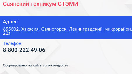 Саянский техникум СТЭМИ по адресу 655602, Хакасия, Саяногорск, Ленинградский микрорайон, 22а в дальнейшем Организация, размещена в следующих категориях: