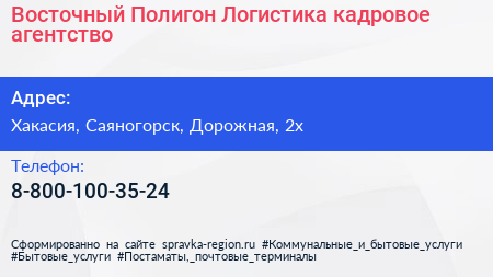 Восточный Полигон Логистика, кадровое агентство по адресу Хакасия, Саяногорск, Дорожная, 2х в дальнейшем Организация, размещена в следующих категориях: