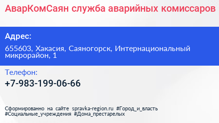 АварКомСаян, служба аварийных комиссаров по адресу 655603, Хакасия, Саяногорск, Интернациональный микрорайон, 1 в дальнейшем Организация, размещена в следующих категориях: