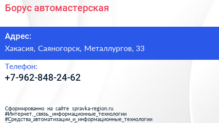 Борус, автомастерская по адресу Хакасия, Саяногорск, Металлургов, 33 в дальнейшем Организация, размещена в следующих категориях: