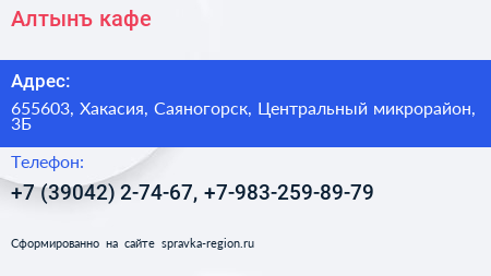 Алтынъ, кафе по адресу 655603, Хакасия, Саяногорск, Центральный микрорайон, 3Б в дальнейшем Организация, размещена в следующих категориях: