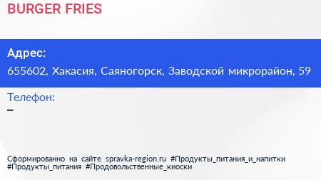 BURGER FRIES по адресу 655602, Хакасия, Саяногорск, Заводской микрорайон, 59 в дальнейшем Организация, размещена в следующих категориях: