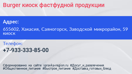 Burger, киоск фастфудной продукции по адресу 655602, Хакасия, Саяногорск, Заводской микрорайон, 59 киоск в дальнейшем Организация, размещена в следующих категориях: