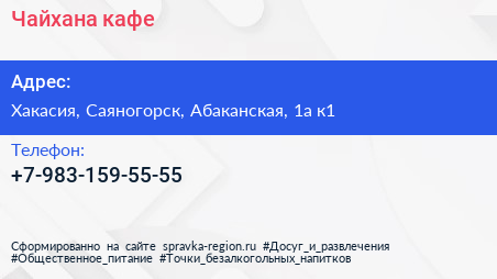 Чайхана, кафе по адресу Хакасия, Саяногорск, Абаканская, 1а к1 в дальнейшем Организация, размещена в следующих категориях: