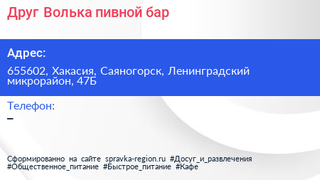 Друг Волька, пивной бар по адресу 655602, Хакасия, Саяногорск, Ленинградский микрорайон, 47Б в дальнейшем Организация, размещена в следующих категориях: