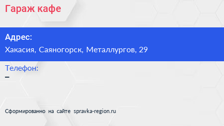 Гараж, кафе по адресу Хакасия, Саяногорск, Металлургов, 29 в дальнейшем Организация, размещена в следующих категориях:
