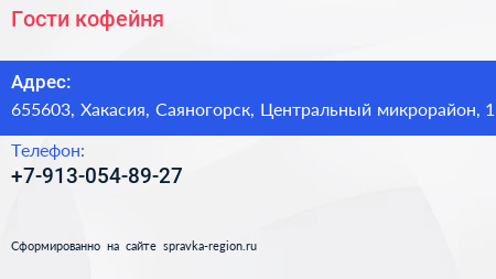 Гости, кофейня по адресу 655603, Хакасия, Саяногорск, Центральный микрорайон, 1 в дальнейшем Организация, размещена в следующих категориях: