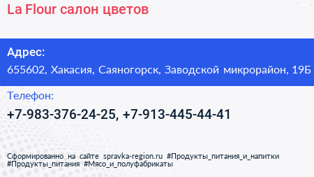 La Flour, салон цветов по адресу 655602, Хакасия, Саяногорск, Заводской микрорайон, 19Б в дальнейшем Организация, размещена в следующих категориях: