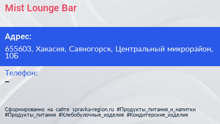 Mist Lounge Bar по адресу 655603, Хакасия, Саяногорск, Центральный микрорайон, 10Б в дальнейшем Организация, размещена в следующих категориях: