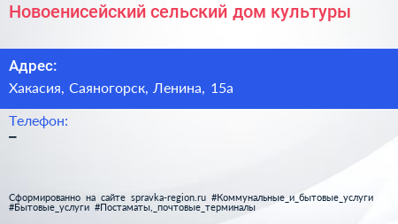 Новоенисейский сельский дом культуры по адресу Хакасия, Саяногорск, Ленина, 15а в дальнейшем Организация, размещена в следующих категориях: