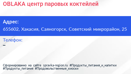 OBLAKA, центр паровых коктейлей по адресу 655602, Хакасия, Саяногорск, Советский микрорайон, 25 в дальнейшем Организация, размещена в следующих категориях:
