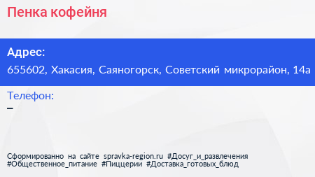 Пенка, кофейня по адресу 655602, Хакасия, Саяногорск, Советский микрорайон, 14а в дальнейшем Организация, размещена в следующих категориях: