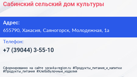 Сабинский сельский дом культуры по адресу 655790, Хакасия, Саяногорск, Молодежная, 1а в дальнейшем Организация, размещена в следующих категориях: