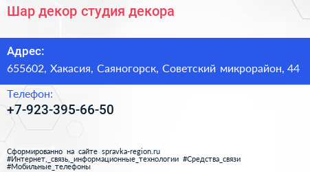 Шар-декор, студия декора по адресу 655602, Хакасия, Саяногорск, Советский микрорайон, 44 в дальнейшем Организация, размещена в следующих категориях: