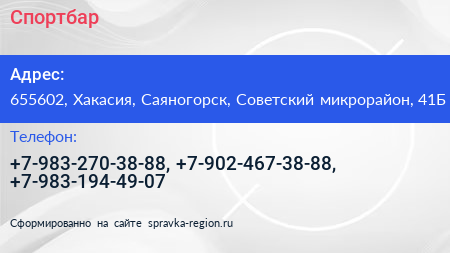 Спортбар по адресу 655602, Хакасия, Саяногорск, Советский микрорайон, 41Б в дальнейшем Организация, размещена в следующих категориях: