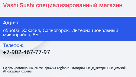 Vashi Sushi, специализированный магазин по адресу 655603, Хакасия, Саяногорск, Интернациональный микрорайон, 8Б в дальнейшем Организация, размещена в следующих категориях:
