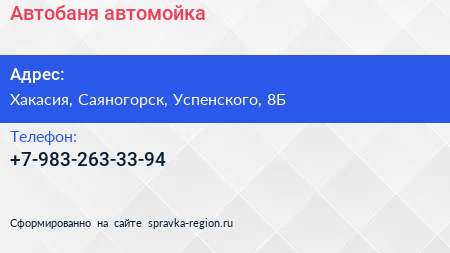 Автобаня, автомойка по адресу Хакасия, Саяногорск, Успенского, 8Б в дальнейшем Организация, размещена в следующих категориях: