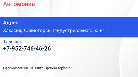 Автомойка по адресу Хакасия, Саяногорск, Индустриальная, 5а к1 в дальнейшем Организация, размещена в следующих категориях: