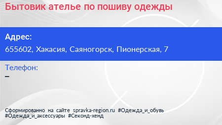 Бытовик, ателье по пошиву одежды по адресу 655602, Хакасия, Саяногорск, Пионерская, 7 в дальнейшем Организация, размещена в следующих категориях: