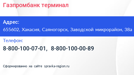 Газпромбанк, терминал по адресу 655602, Хакасия, Саяногорск, Заводской микрорайон, 38а в дальнейшем Организация, размещена в следующих категориях:
