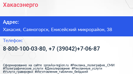 Хакасэнерго по адресу Хакасия, Саяногорск, Енисейский микрорайон, 38 в дальнейшем Организация, размещена в следующих категориях: