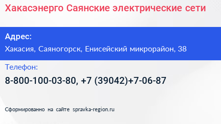 Хакасэнерго, Саянские электрические сети по адресу Хакасия, Саяногорск, Енисейский микрорайон, 38 в дальнейшем Организация, размещена в следующих категориях: