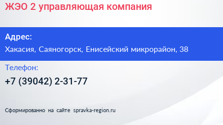 ЖЭО-2, управляющая компания по адресу Хакасия, Саяногорск, Енисейский микрорайон, 38 в дальнейшем Организация, размещена в следующих категориях: