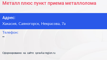 Металл плюс, пункт приема металлолома по адресу Хакасия, Саяногорск, Некрасова, 7а в дальнейшем Организация, размещена в следующих категориях: