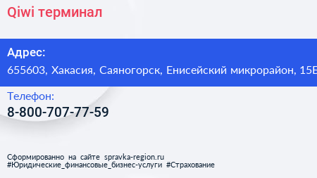 Qiwi, терминал по адресу 655603, Хакасия, Саяногорск, Енисейский микрорайон, 15Б в дальнейшем Организация, размещена в следующих категориях: