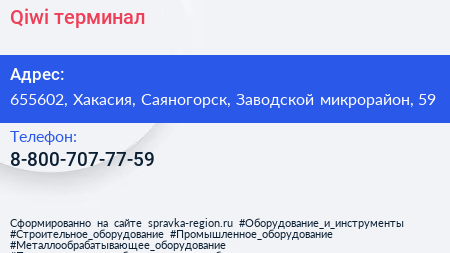 Qiwi, терминал по адресу 655602, Хакасия, Саяногорск, Заводской микрорайон, 59 в дальнейшем Организация, размещена в следующих категориях: