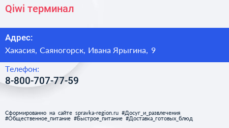 Qiwi, терминал по адресу Хакасия, Саяногорск, Ивана Ярыгина, 9 в дальнейшем Организация, размещена в следующих категориях: