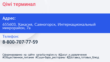 Qiwi, терминал по адресу 655603, Хакасия, Саяногорск, Интернациональный микрорайон, 7а в дальнейшем Организация, размещена в следующих категориях: