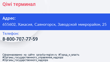 Qiwi, терминал по адресу 655602, Хакасия, Саяногорск, Заводской микрорайон, 25 в дальнейшем Организация, размещена в следующих категориях: