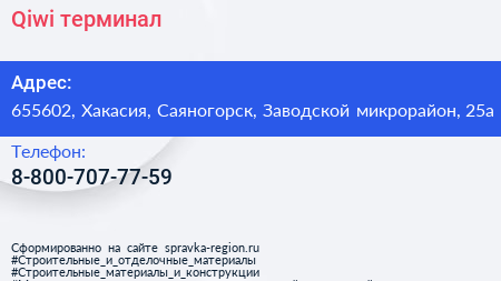 Qiwi, терминал по адресу 655602, Хакасия, Саяногорск, Заводской микрорайон, 25а в дальнейшем Организация, размещена в следующих категориях: