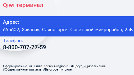 Qiwi, терминал по адресу 655602, Хакасия, Саяногорск, Советский микрорайон, 25Б в дальнейшем Организация, размещена в следующих категориях: