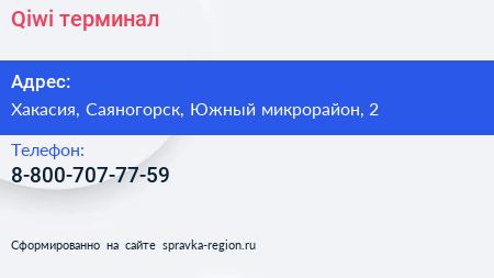 Qiwi, терминал по адресу Хакасия, Саяногорск, Южный микрорайон, 2 в дальнейшем Организация, размещена в следующих категориях: