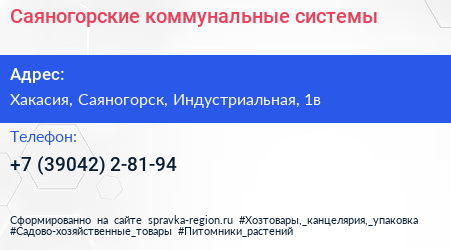 Саяногорские коммунальные системы по адресу Хакасия, Саяногорск, Индустриальная, 1в в дальнейшем Организация, размещена в следующих категориях: