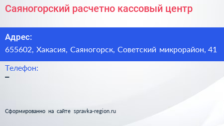 Саяногорский расчетно-кассовый центр по адресу 655602, Хакасия, Саяногорск, Советский микрорайон, 41 в дальнейшем Организация, размещена в следующих категориях: