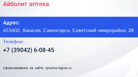 Айболит, аптека по адресу 655602, Хакасия, Саяногорск, Советский микрорайон, 28 в дальнейшем Организация, размещена в следующих категориях: