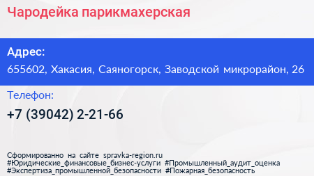 Чародейка, парикмахерская по адресу 655602, Хакасия, Саяногорск, Заводской микрорайон, 26 в дальнейшем Организация, размещена в следующих категориях: