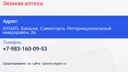 Эконом, аптека по адресу 655603, Хакасия, Саяногорск, Интернациональный микрорайон, 2а в дальнейшем Организация, размещена в следующих категориях: