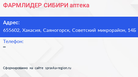 ФАРМЛИДЕР СИБИРИ, аптека по адресу 655602, Хакасия, Саяногорск, Советский микрорайон, 14Б в дальнейшем Организация, размещена в следующих категориях: